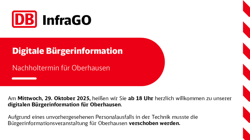 Am Mittwoch, 29. Oktober 2025, heißen wir Sie ab 18 Uhr herzlich willkommen zu unserer digitalen Bürgerinformation für Oberhausen. Aufgrund eines unvorhergesehenen Personalausfalls in der Technik musste die Bürgerinformationsveranstaltung für den Bauabschnitt 1 zunächst verschoben werden.